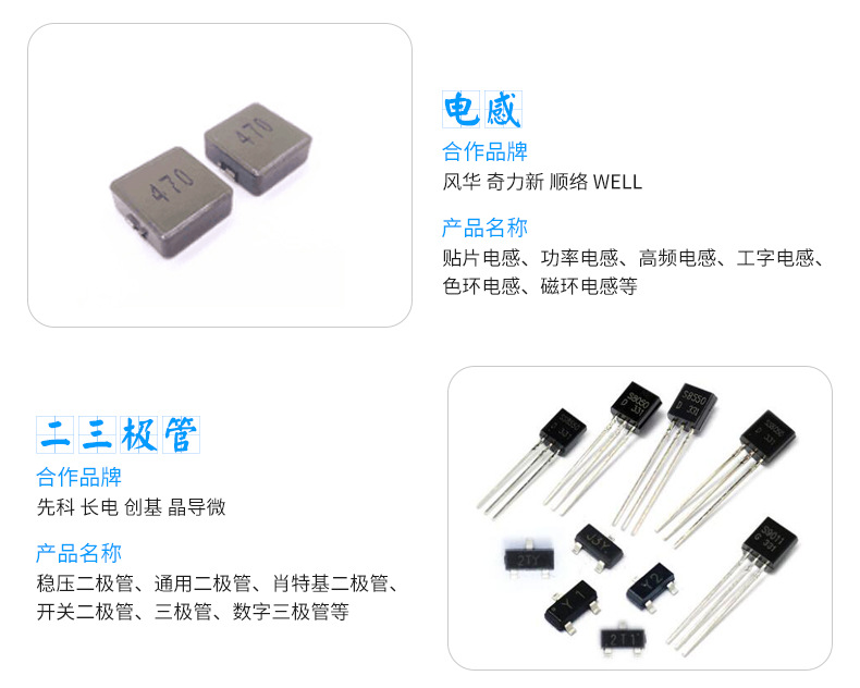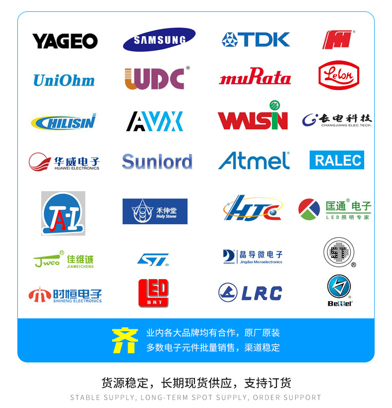 公司主要代理的電子元器件產(chǎn)品有:電阻,電容,電感,二/三極管,IC等電子元器件。 其品牌有:國巨(YAGEO),三星(SAMSUNG),風(fēng)華(FH),立?。↙ELON),厚聲(Uniohm), 村田(muRata), AVX, 威迪(Windy),先科(ST),長電(CJ),佰鴻,億光,ATMEL等。
