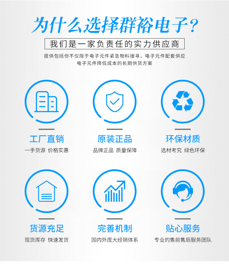 東莞市群裕電子有限公司—創(chuàng)建于2007年,是一家從事國內(nèi)外知名品牌電子元器件的配套服務公司。通過幾年的努力,公司規(guī)模日益擴大,目前涉及的領域有電子元器件代理。