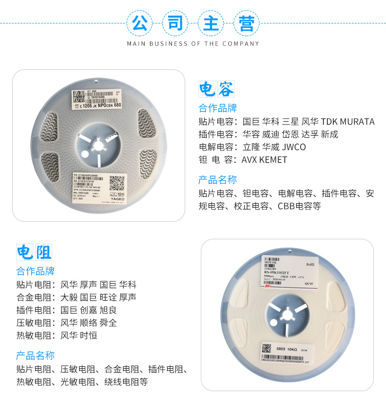 公司主要代理的電子元器件產(chǎn)品有:電阻,電容,電感,二/三極管,IC等電子元器件。 其品牌有:國巨(YAGEO),三星(SAMSUNG),風華(FH),立隆(LELON),厚聲(Uniohm), 村田(muRata), AVX, 威迪(Windy),先科(ST),長電(CJ),佰鴻,億光,ATMEL等。
